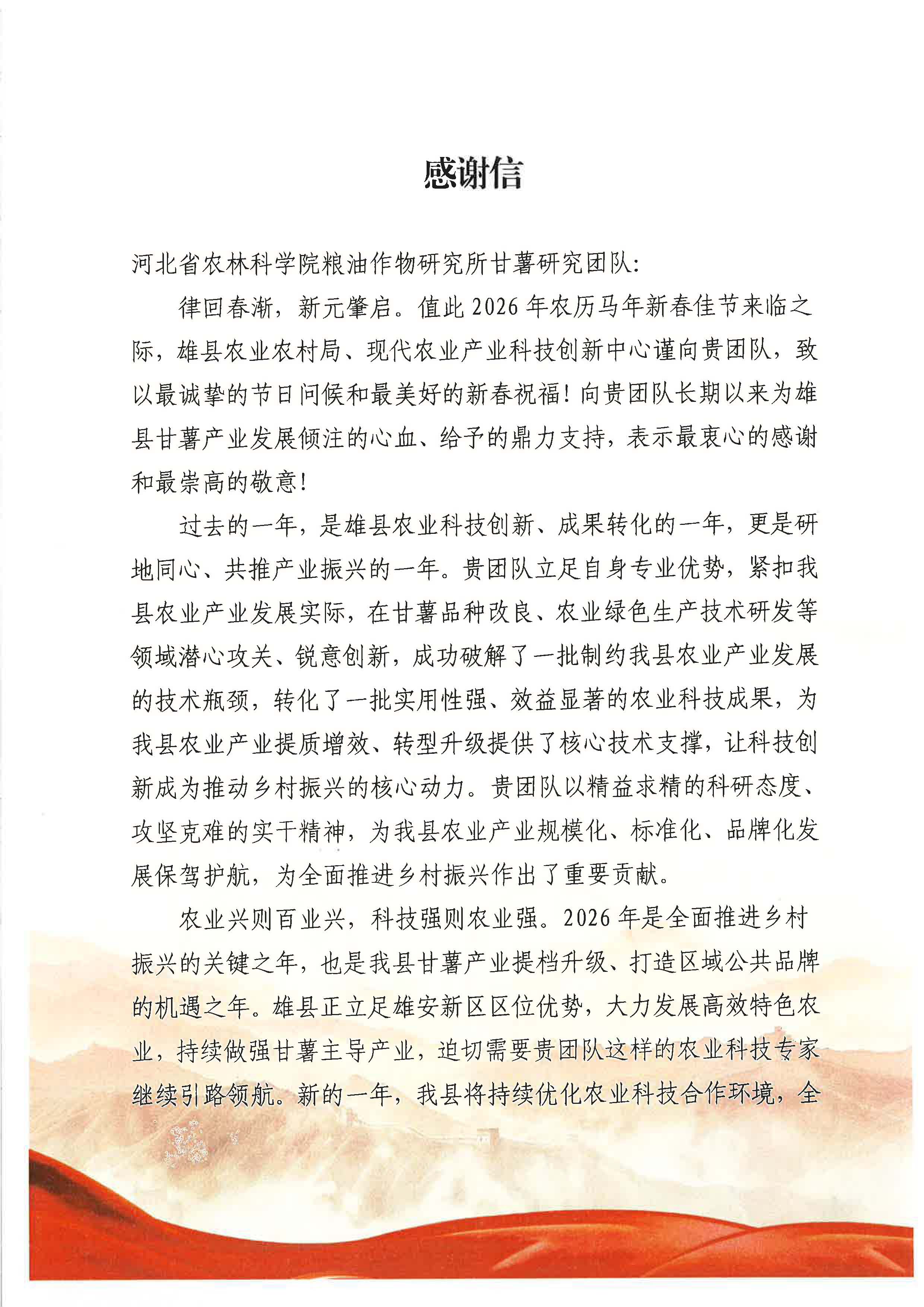 雄县农业农村局向我所发来感谢信